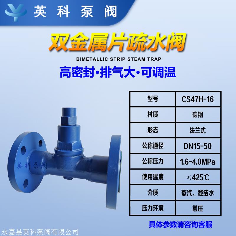 双金属疏水阀CS47H,构造与众不同,性能优良,排量大,蒸汽泄漏温度可调,过冷度约为2℃,可排除大量冷空气和其他非凝结蒸汽,不会致使蒸汽阻塞现象。内部组件可更换,容易维修和调节。