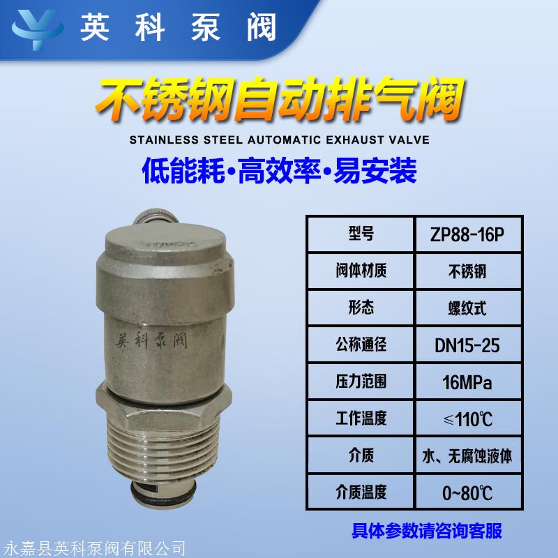 1.自动排气阀ZP88-16p不锈钢,产品设计新颖,构造奇特。底部设有单向自动关闭设备,容易维护,上部通气口为单独关闭构造。