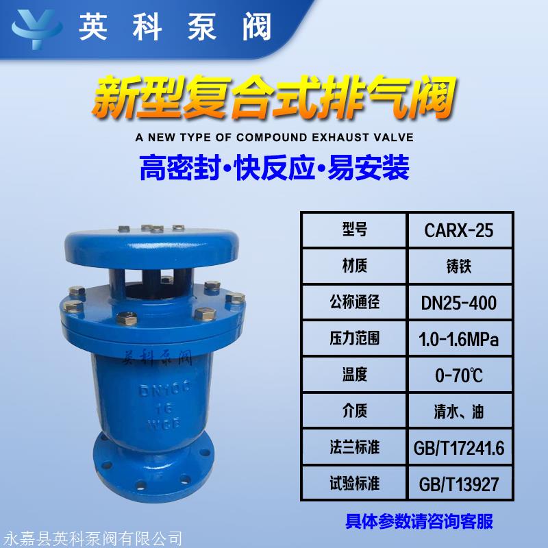 一种新型的复合排气阀CARXdie高密封,用以管道上或气密处所的点,以去除管道中的气体以清理管道并使管道正常工作。如果未安装,则管道随时都有空气阻力,因此管道的出水能力无法满足设计要求。