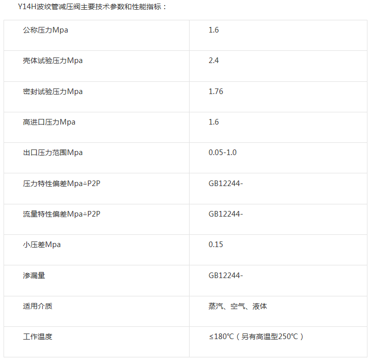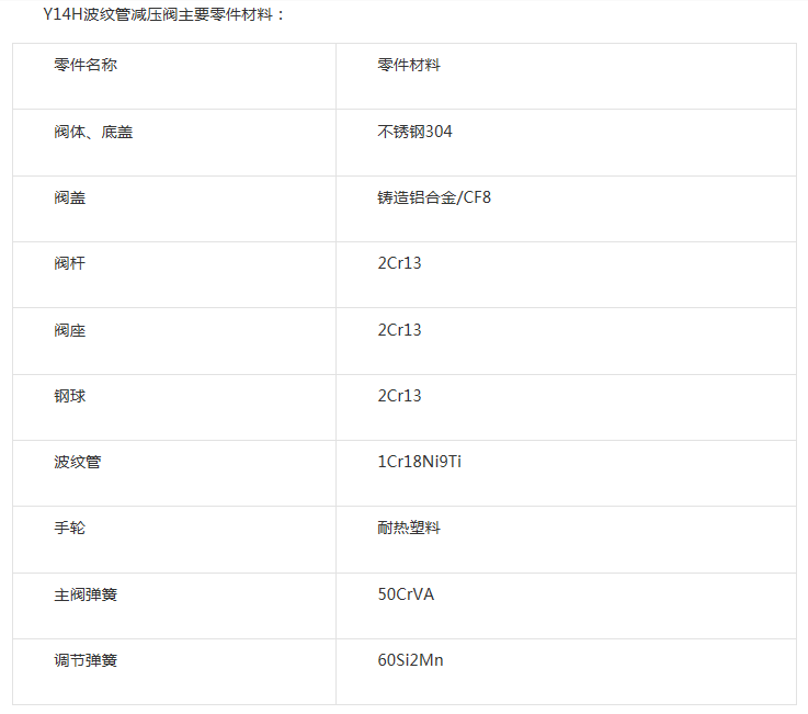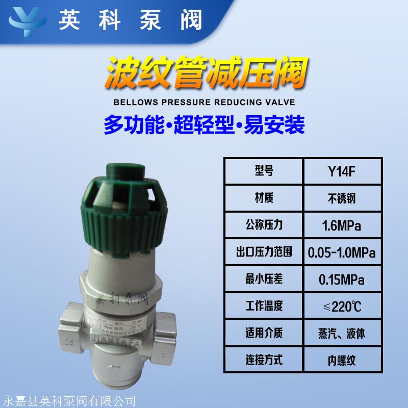 Y14F波纹管式减压阀,主要由阀座,阀盘(钢球),波纹管总成,弹簧等构成,出口压力通过调节弹簧来设定。当出口压力减低时,阀瓣开度增加。当出口压力达到预定压力时,阀瓣开度减小,这主要是因为压力通过介质的阀效用在波纹管的区域上。实现弹簧的减压稳定功用,使用时可通过旋转塑料手轮来调节压力,不用工具调整,连接安装便捷。内部构造使用波纹管,密封面装有过滤器保护装置,不易毁损内部零部件,大大提高了使用寿命。