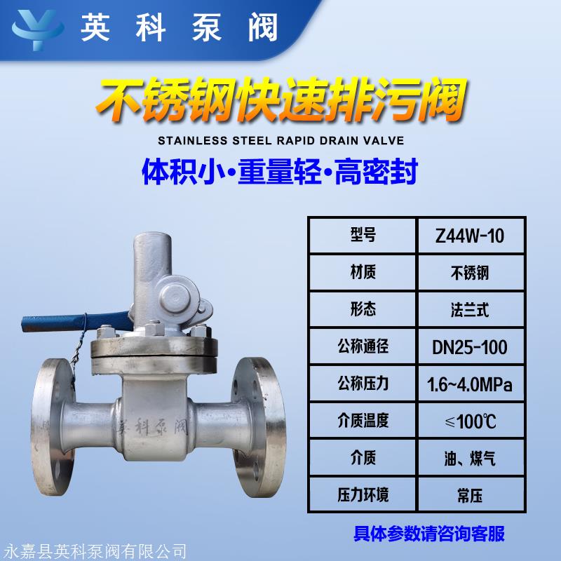法兰快速排污阀Z44W不锈钢不仅结构简单,密封性好,而且体积小,重量轻,材料消耗少,安装尺寸小,特别适用于驱动和定期排污。排污阀pn≤2.0mpa的高压锅炉,可同时排出5个通道,也可同时排出1个通道。