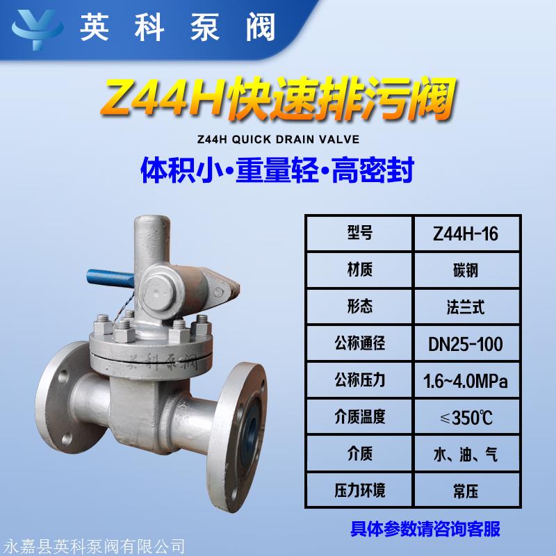 手动快速排污阀Z44H炭钢法兰用水,是从闸阀演变而来,运用齿轮转动90℃带动阀杆升起,达到启闭的目的。快速排污阀不仅简单结构,密封性好,而且体积小,重量轻,材质消耗少,安装尺寸小,特别是驱动扭矩小,操作简单,容易实现快速启闭。