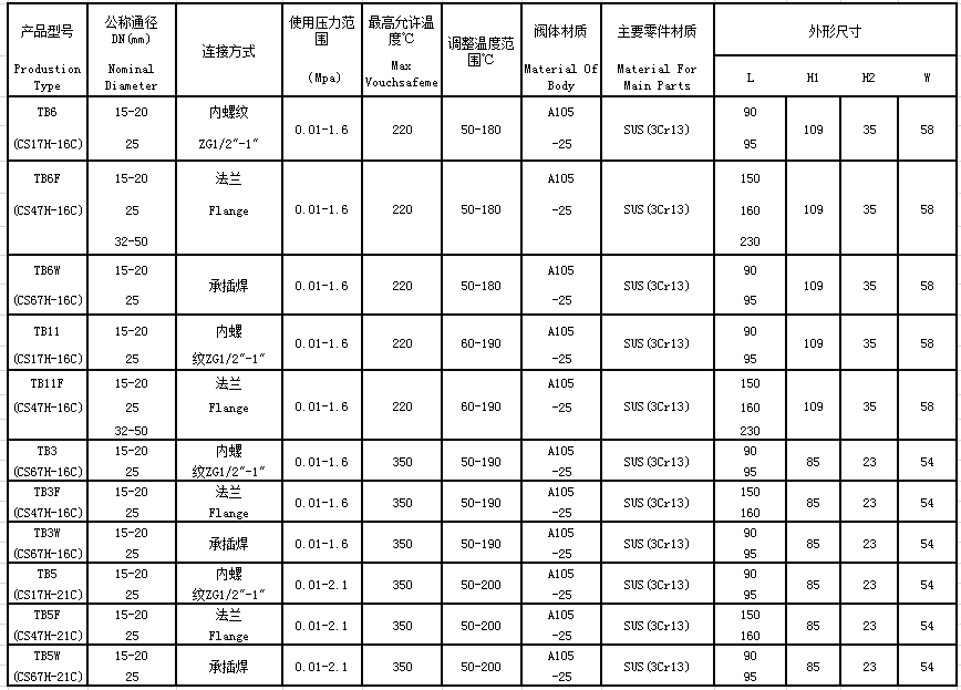 TB11F可调节的双金属疏水阀主要形状和连接尺码: