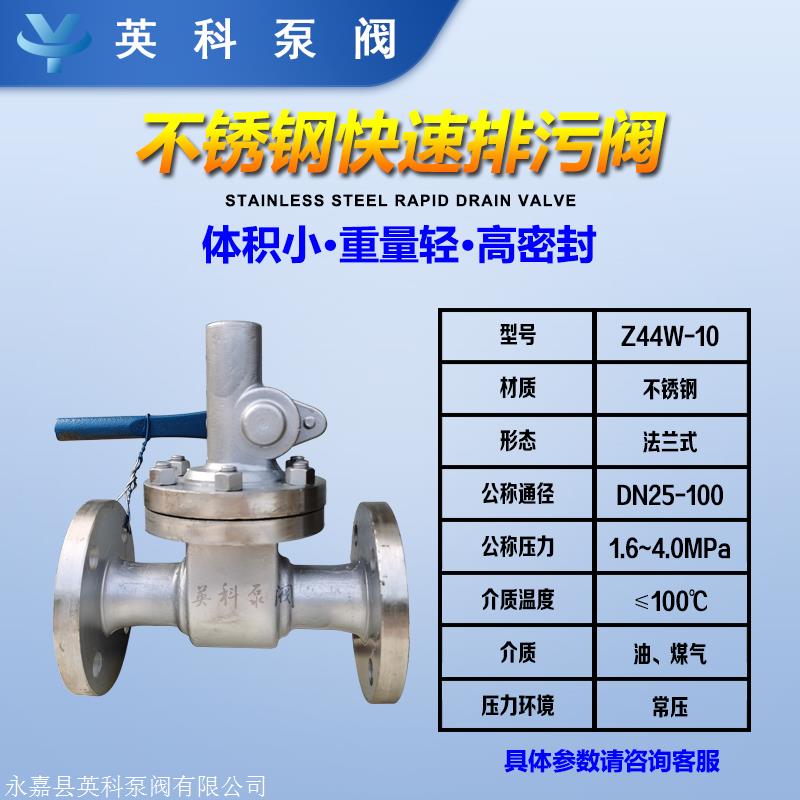 不锈钢快泄阀Z44W是从闸阀演变而来的,它运用齿轮转动90℃来驱动阀杆升起,以达到开启和关闭的目的。快速排污阀不仅结构简便,密封性好,而且体积小,重量轻,材质耗费低,安装尺寸小,特别是驱动扭矩小,操作简便,容易实现快速启闭。