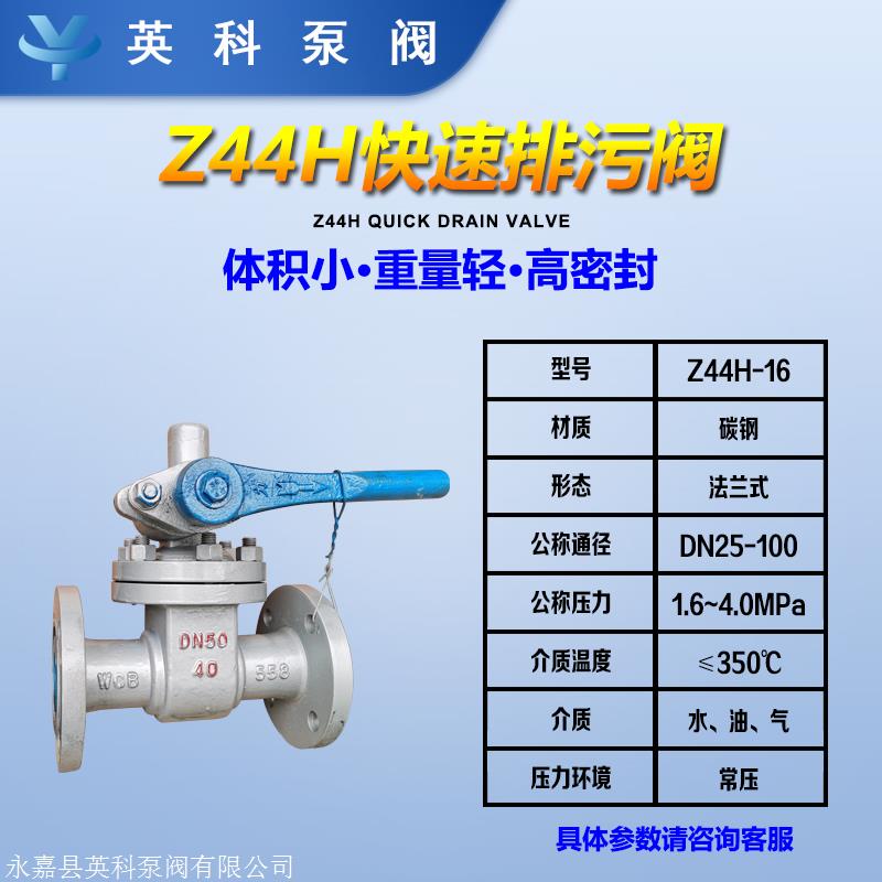 快速排污阀Z44H法兰碳钢是从闸阀演变而来的,它运用齿轮转动90℃来驱动阀杆升起,从而达到开启和关闭的目的。快速排污阀不仅简便易用结构,密封性好,而且体积小,重量轻,材质损耗低,安装尺寸小,特别是驱动力矩小,操作简便,容易实现快速启闭。