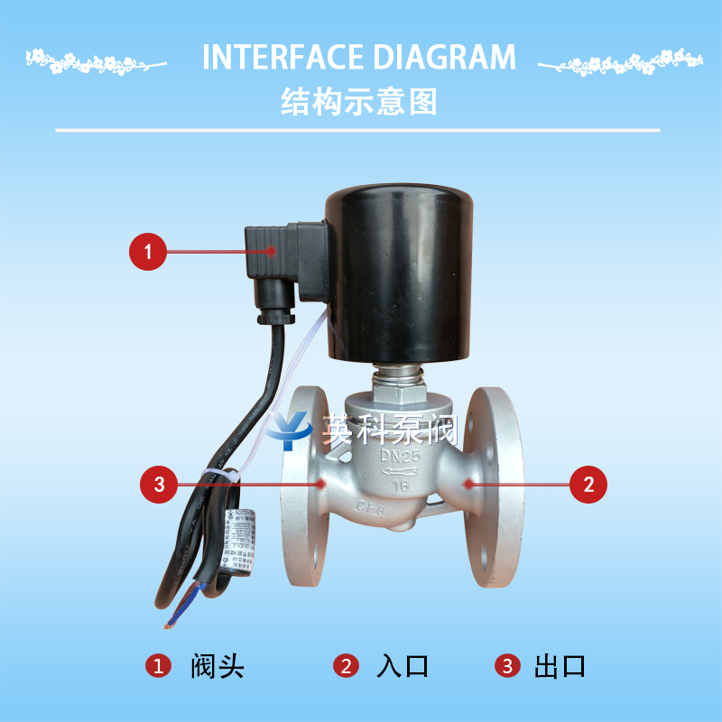 该阀是逐步的直接导向电磁阀。电源关闭时,根据开关状况可分成常闭电磁阀和常开电磁阀。线圈通电后,电枢首先在电磁力的作用下驱动辅助阀打开。主阀在形成的介质压差和电磁力的作用下打开,线圈断电,电枢构件复位,主阀和辅助阀在介质压力的作用下紧密关闭。