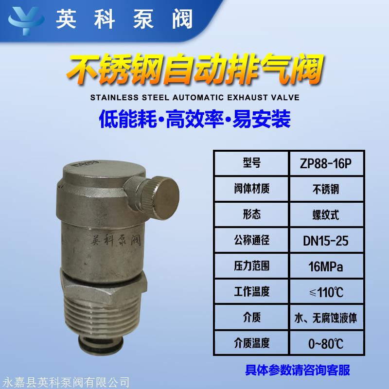 不锈钢自动排气阀ZP88,普遍用以热水加热系统,冷水空调机和热水加热系统,风机盘管和消火栓以排出空气,这是保证系统正常运转和必不可少的产品。扫除系统管道中的空气阻力。