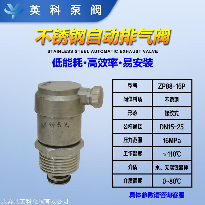 不锈钢自动排气阀ZP88-16P,普遍用以热水加热系统,冷水空调机和热水加热系统,风机盘管和消火栓以排出空气,这是保证系统正常运转和必备的产品。扫除系统管道中的空气阻力。