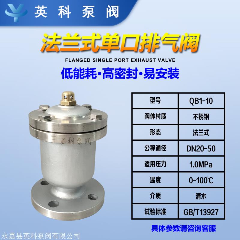法兰单口气阀QB1不锈钢,用以管道中存在封闭气体的地方,扫除管道中的气体以清理管道,以实现正常工作。如果未安装排气门,则管道中流动的液体会产生动态热能并产生气体。形成短路,使管道中的水很容易不符合要求;其次,当管道运转时,会出现断电或泵停机的状况。管道将具备负压,这将致使管道振动或破裂。(排气)吸入阀可将空气很快吸入管道肉中,以预防管道振动或破裂。
