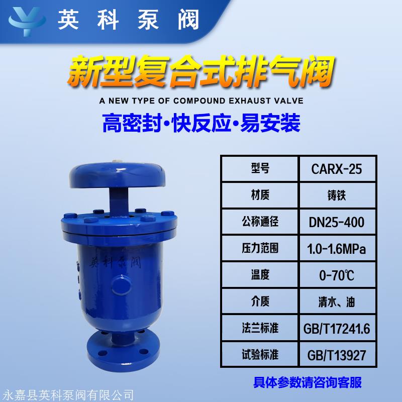 新型复合排气阀铸铁高密封CARX,用以管道上的点或密闭空气处,以去除管道中的气体以疏浚管道并使管道正常工作。如果未安装排气阀,管道随时都有空气阻力,使管道的出水能力无法达到设计要求。
