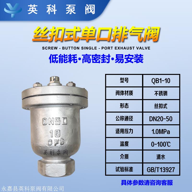 螺纹排气阀QB1不锈钢,主要由阀体,阀,上盖,阀杆,浮子,排气喷嘴等构成。小口径管子用到的管子是φ50-200。它当做管道的排气机能,因此不会出现管道堵塞或空气堵塞的状况。例如,关闭泵电源后,随时都会在管道中产生负压,自动吸气可以维护管道的安全。